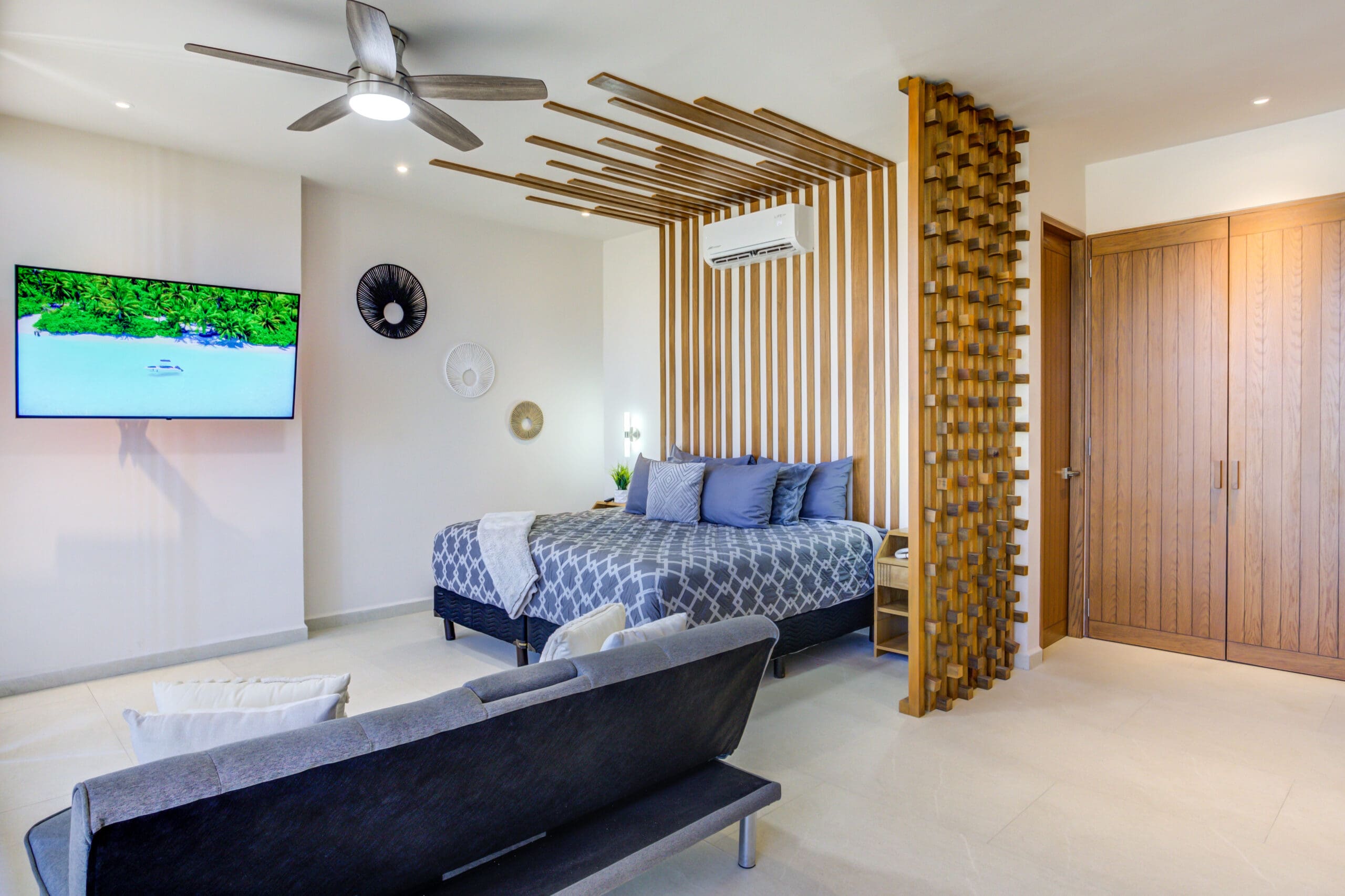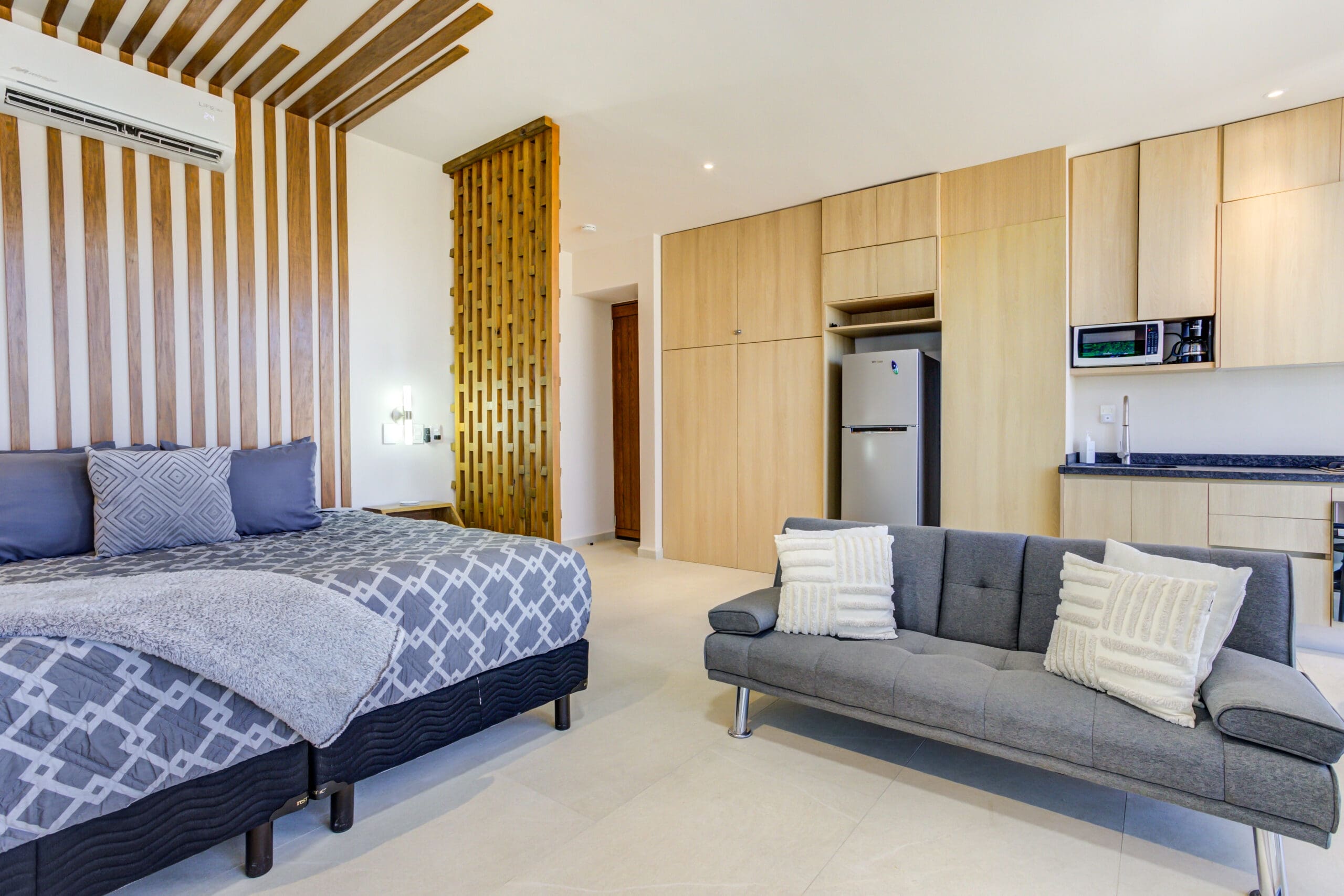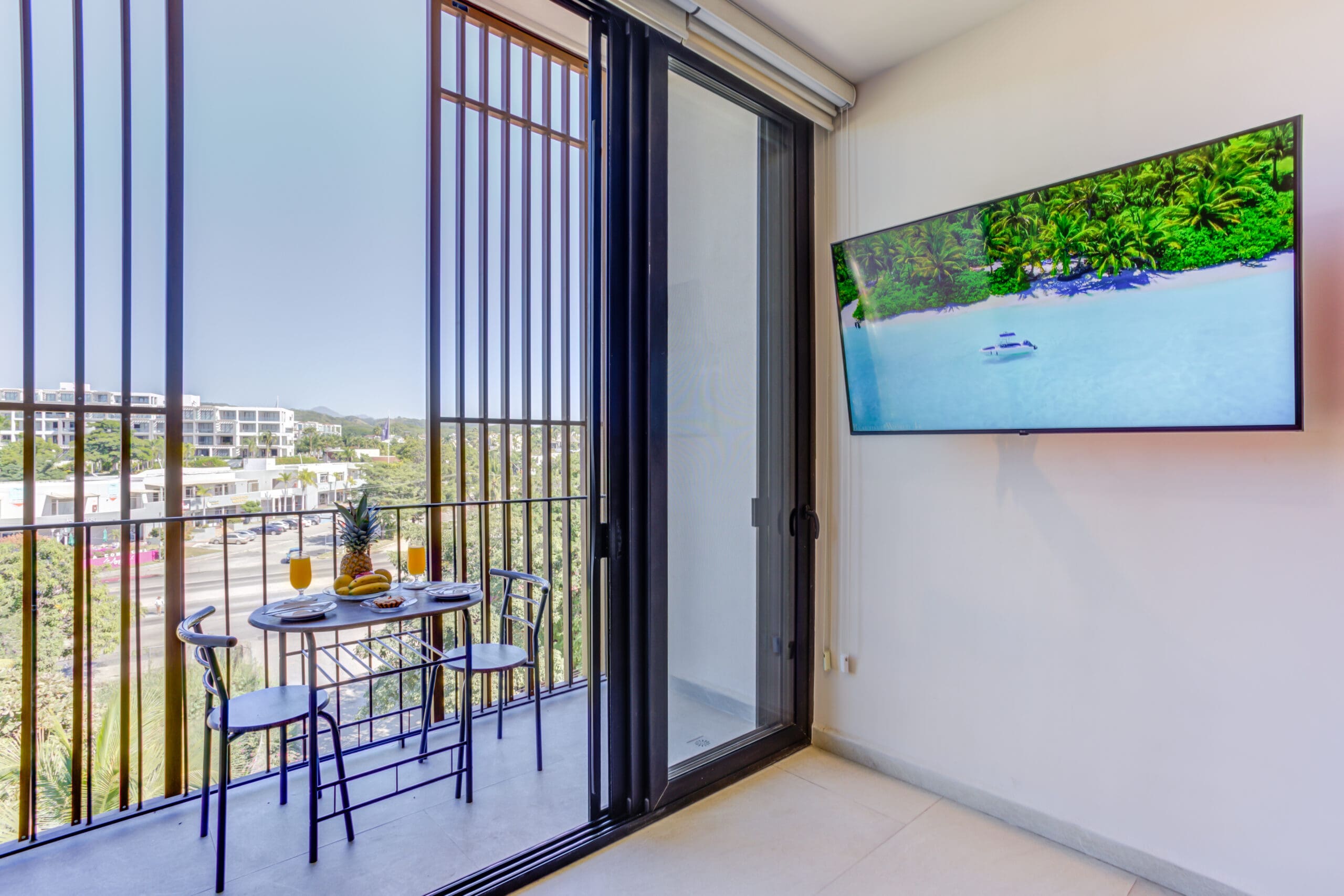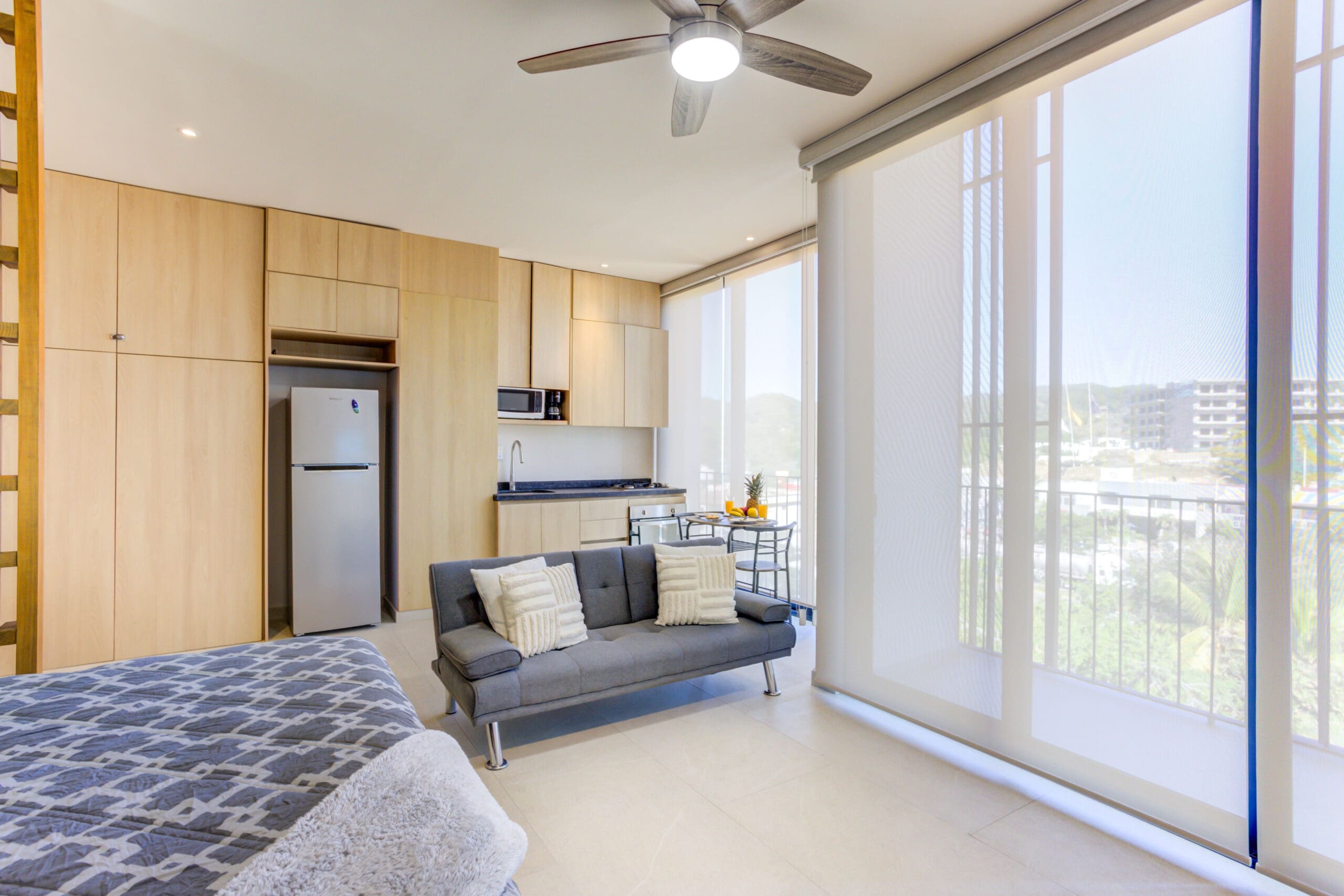 Escápese a nuestro soleado refugio cerca de Playa Bucerías. Este elegante estudio ofrece una amplia terraza para relajarse bajo el sol, cómodos asientos, un televisor de lujo y una cocina completamente equipada.