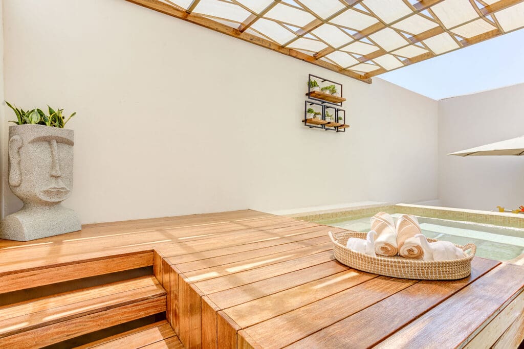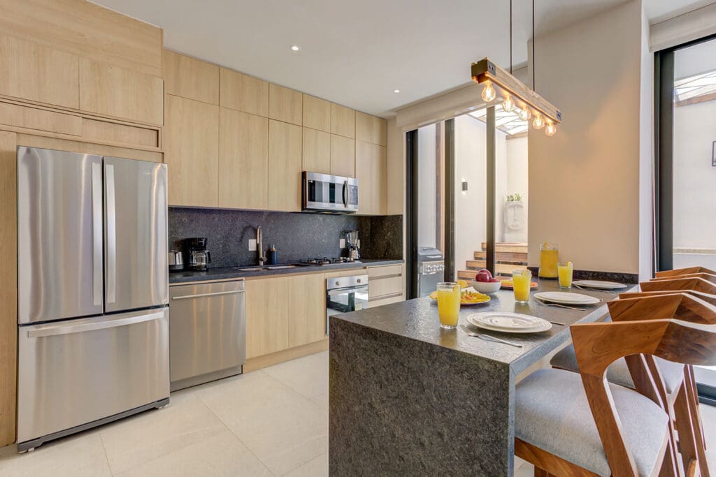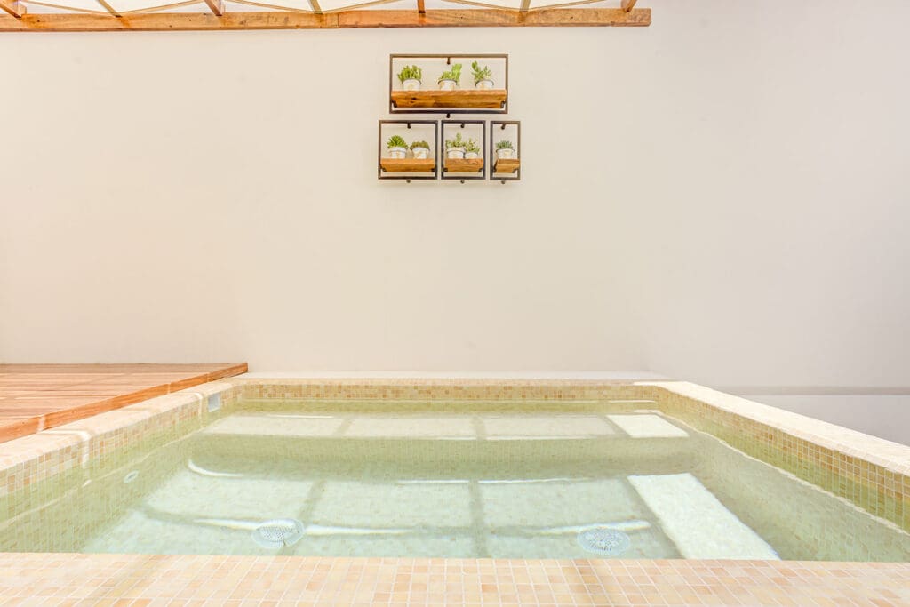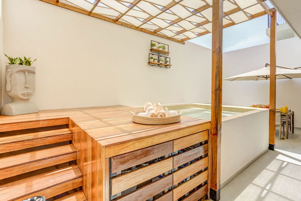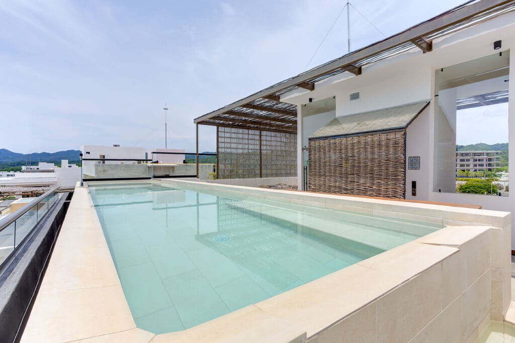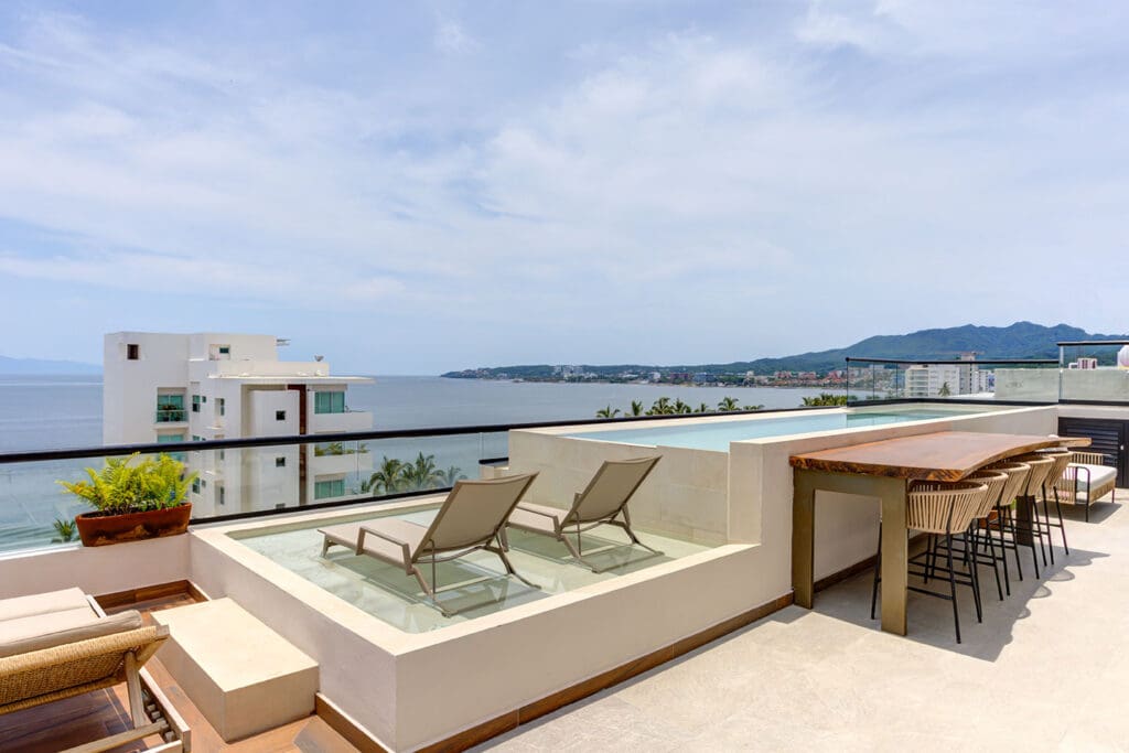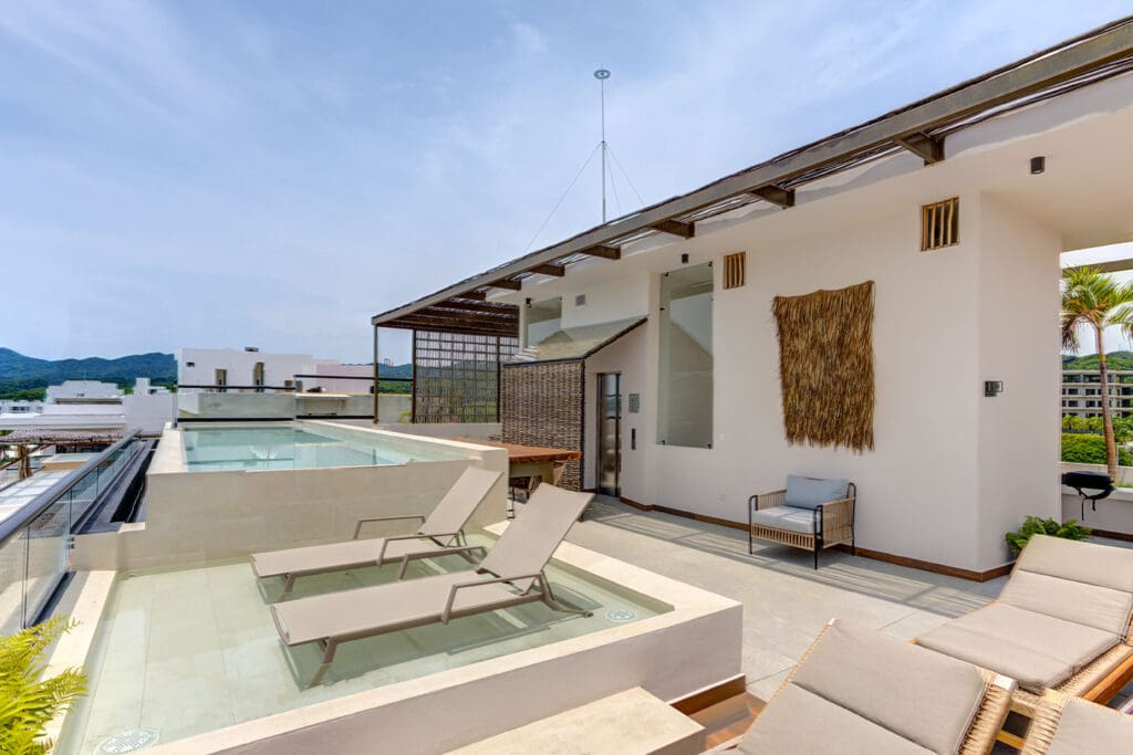 Step into our sunlit haven near Playa Bucerias. Our chic studio boasts a sprawling terrace, perfect for soaking up sunlight. Inside, find plush seating, a deluxe TV, and a gourmet kitchen. Outside, the allure of our plunge pool/hot tub beckons for serene evenings. Retreat to a luxurious king bed.